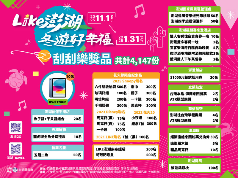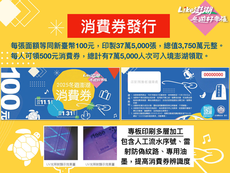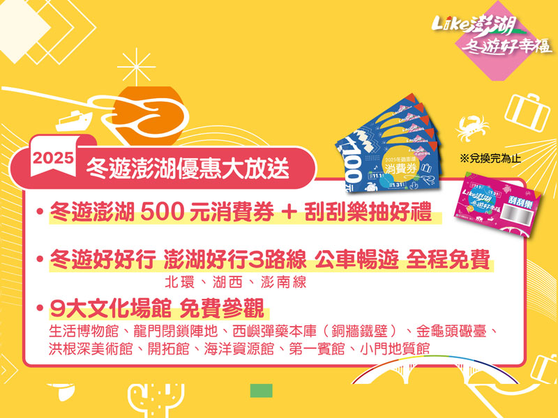 凡於114年11月1日開始到115年1月31日截止,「自由行非澎湖籍」旅客入住海洋渡假村飯店皆可請櫃檯協助辦理冬遊澎湖消費券(含100元消費券5張+刮刮卡1張)。