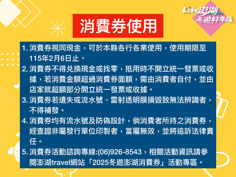 ▌補助消費券數量有限用完為止(可上澎湖縣政府查詢每日剩餘數量)。
